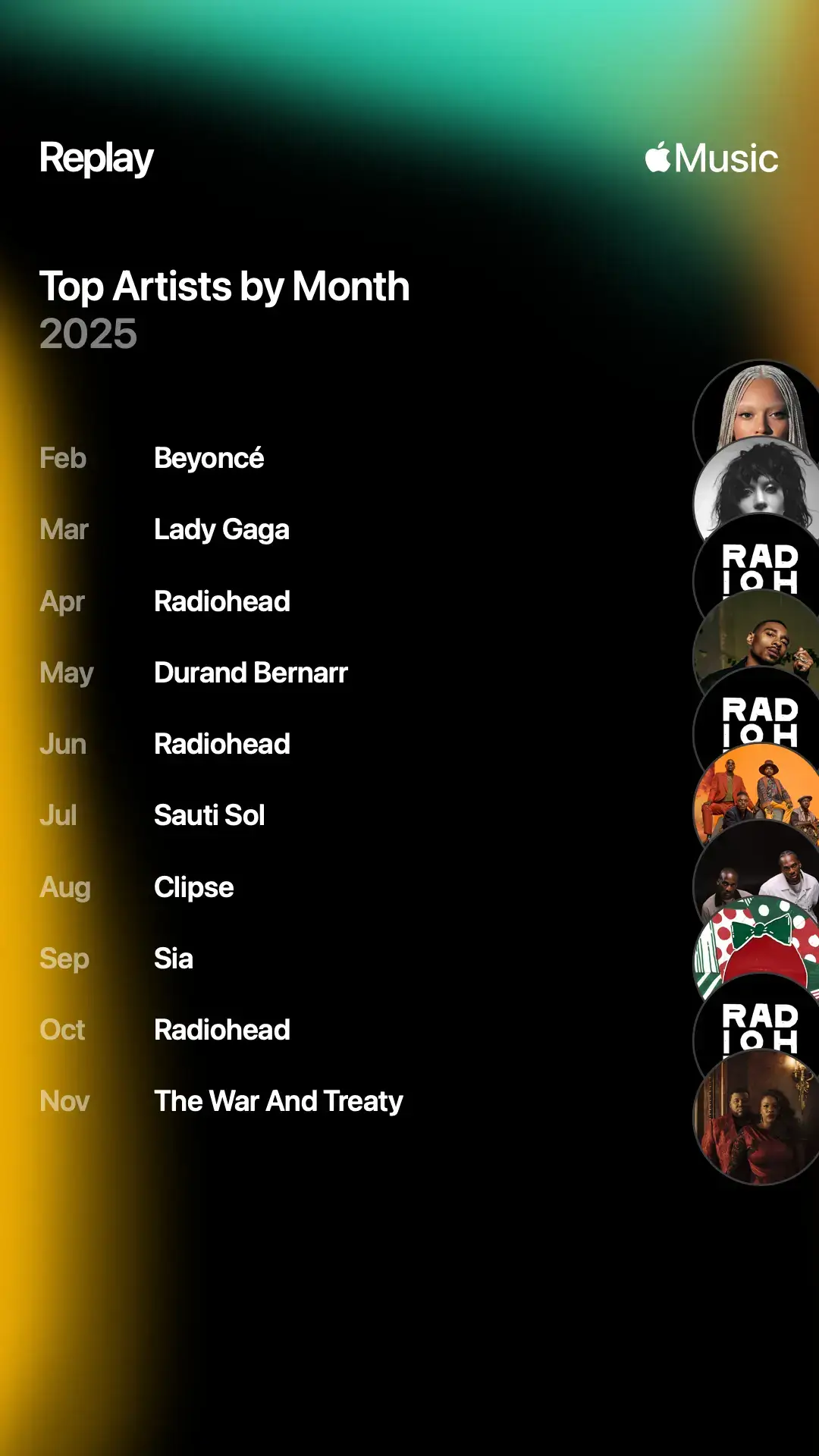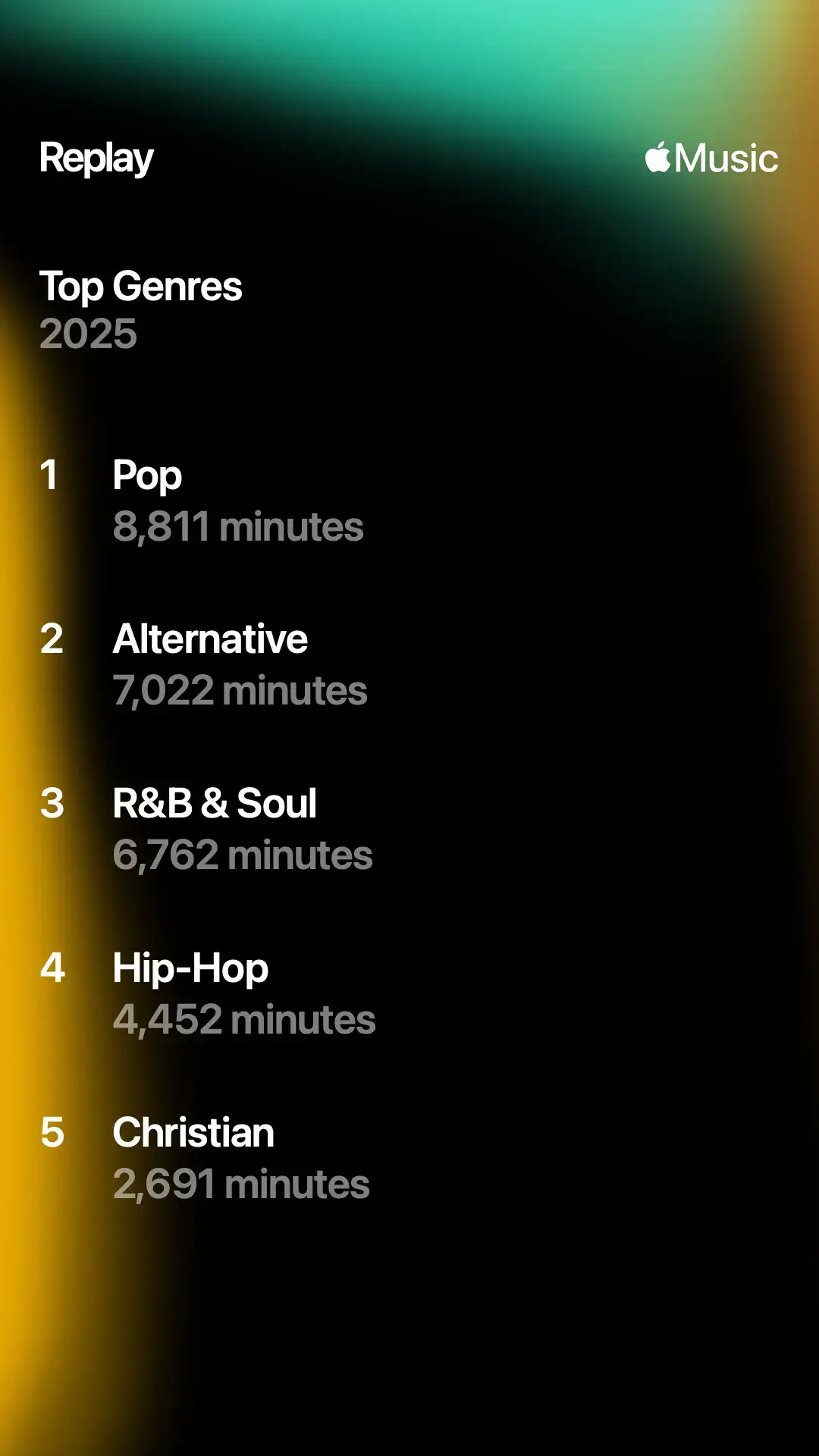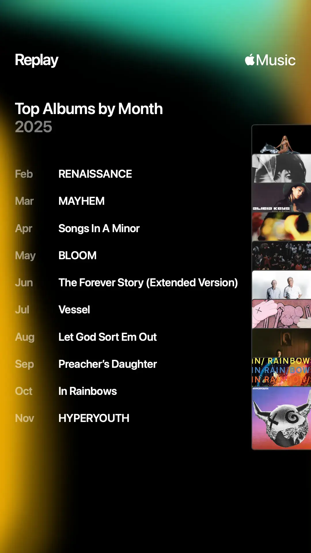 The elephant in the room is I actually stuck with Apple Music after switching to it back in February, so this year’s recap is a little fragmented. I’ll probably post about my time away from Spotify at some point, but I’m enjoying my time off.